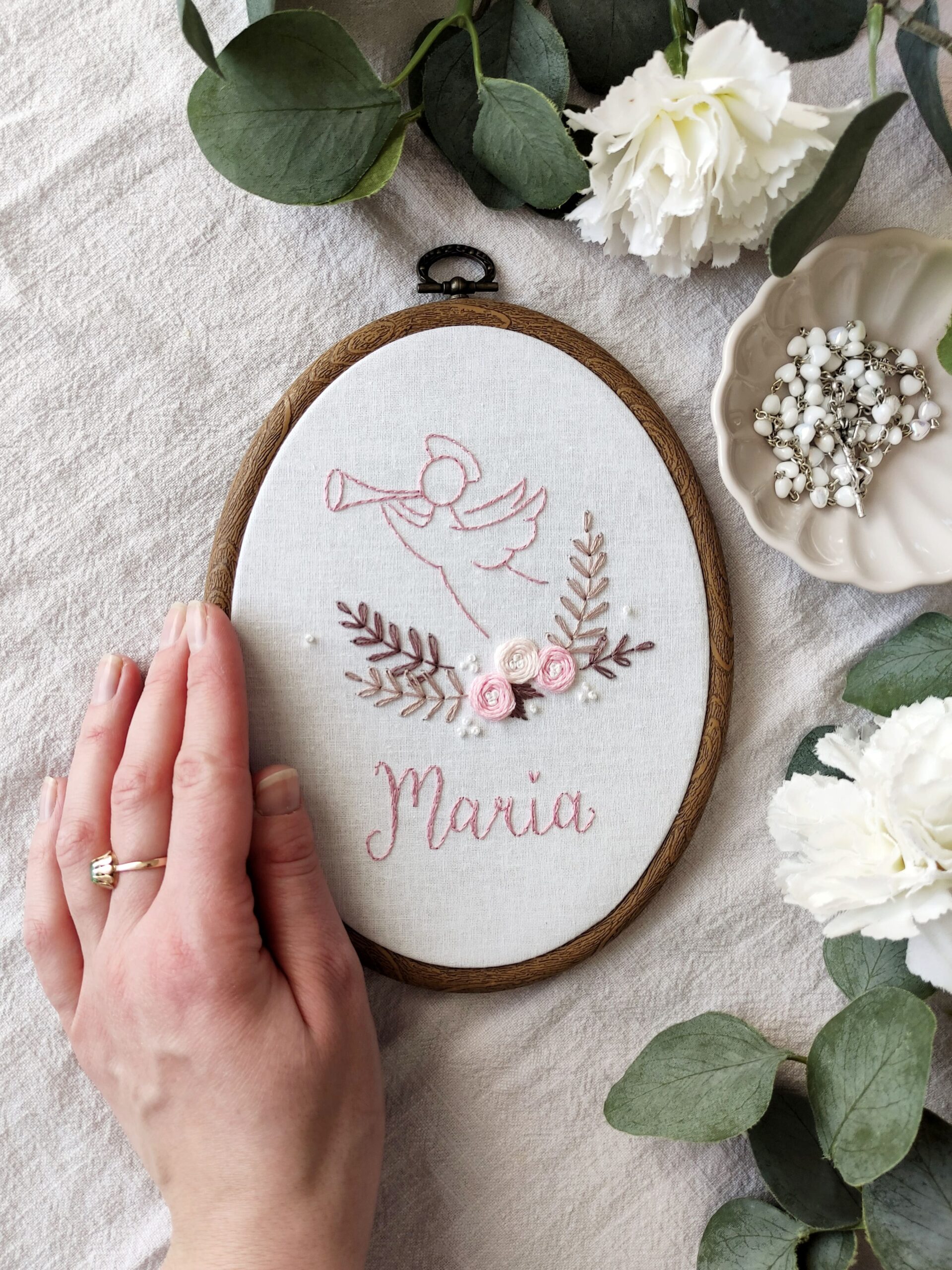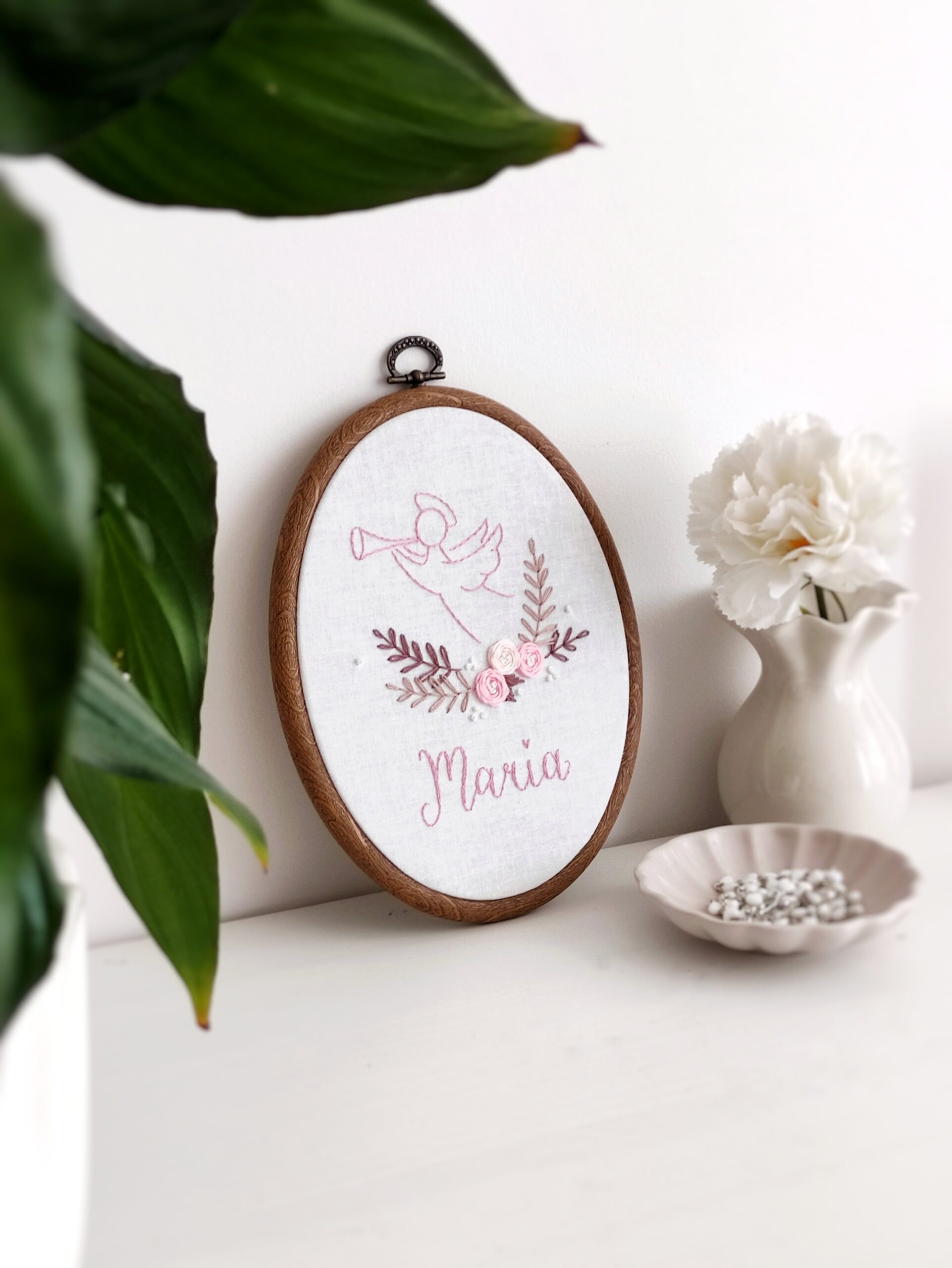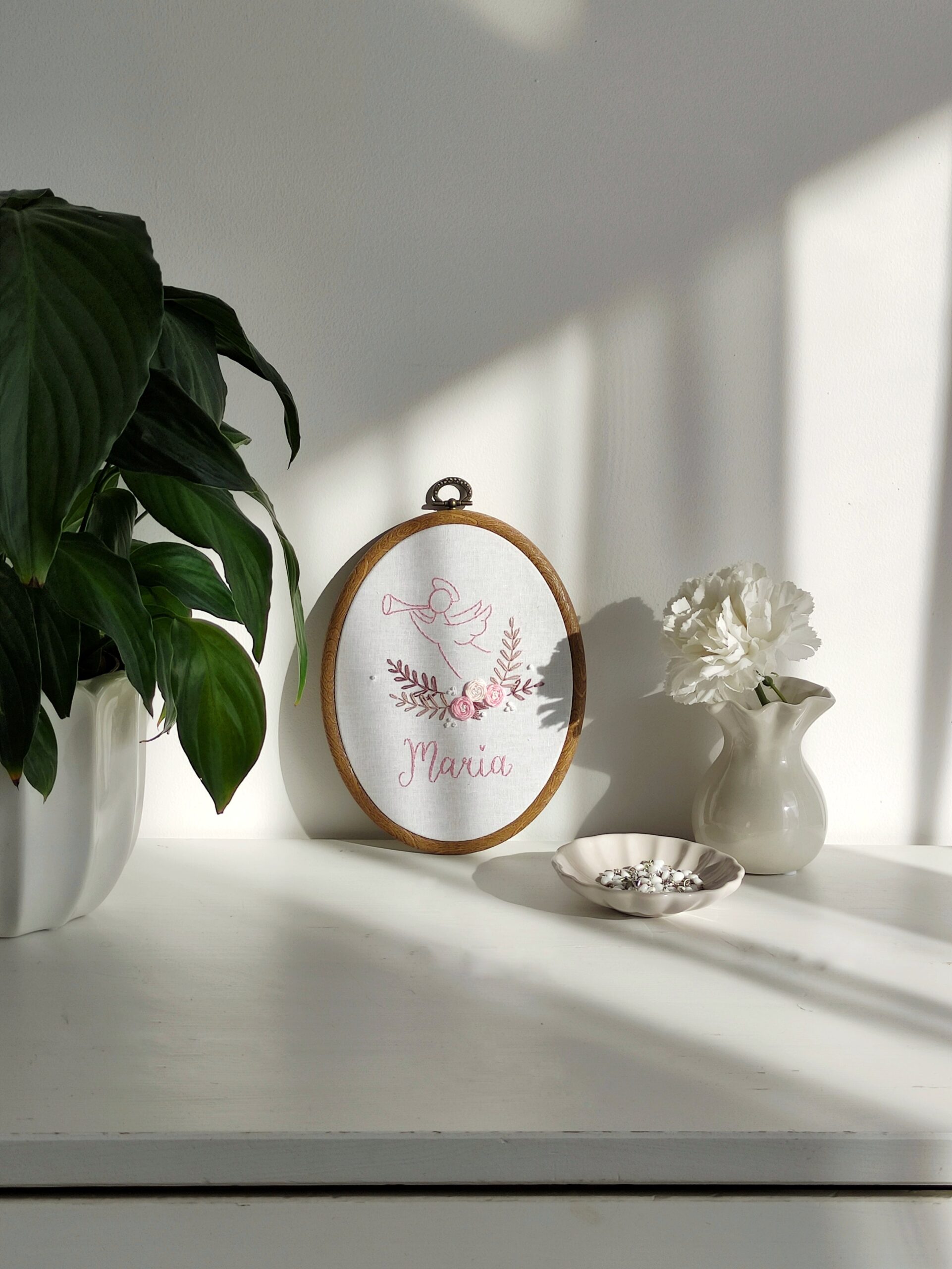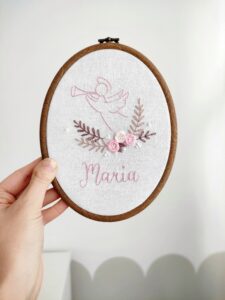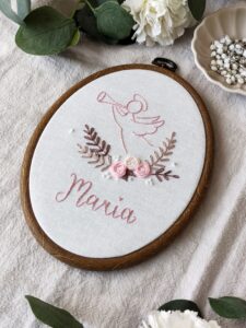 Ręcznie haftowany obrazek z aniołkiem, różyczkami i imieniem dziecka.