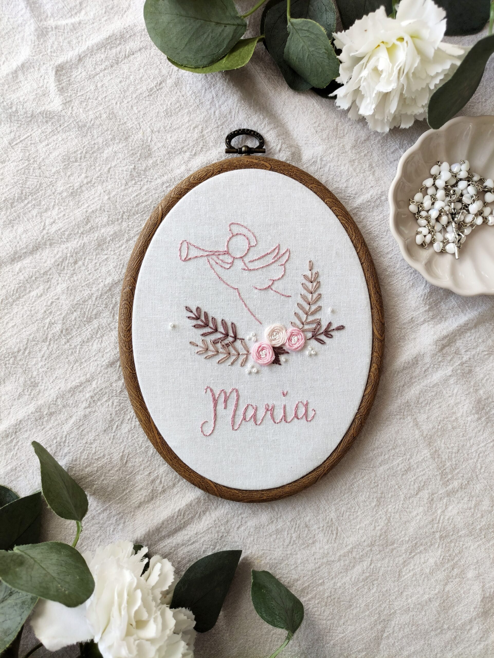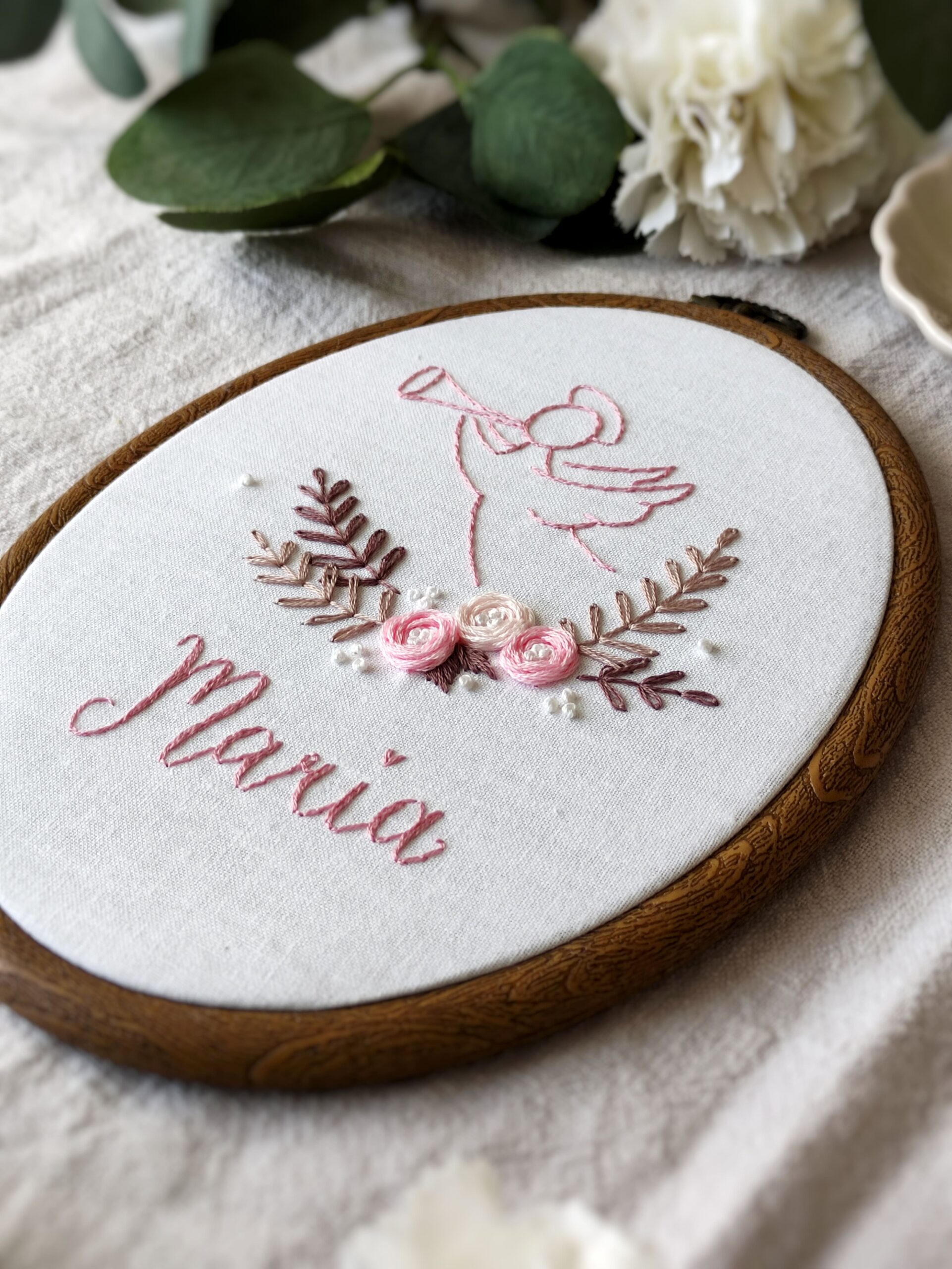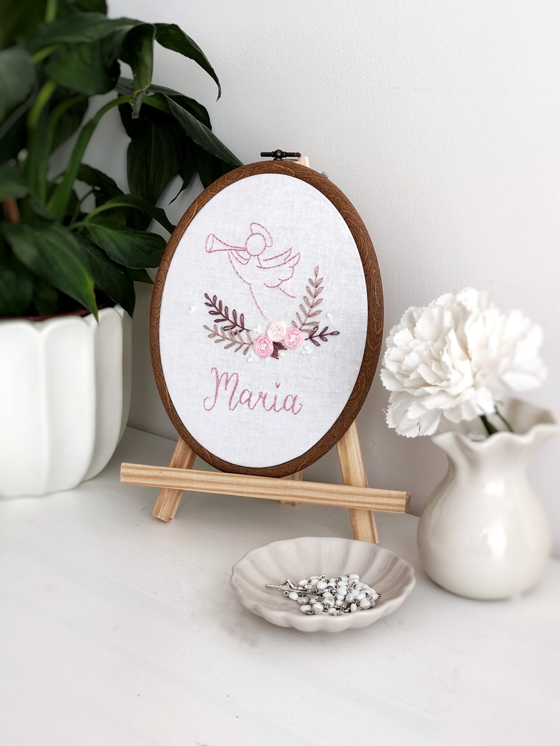 Ręcznie haftowany obrazek z aniołkiem, różyczkami i imieniem dziecka.