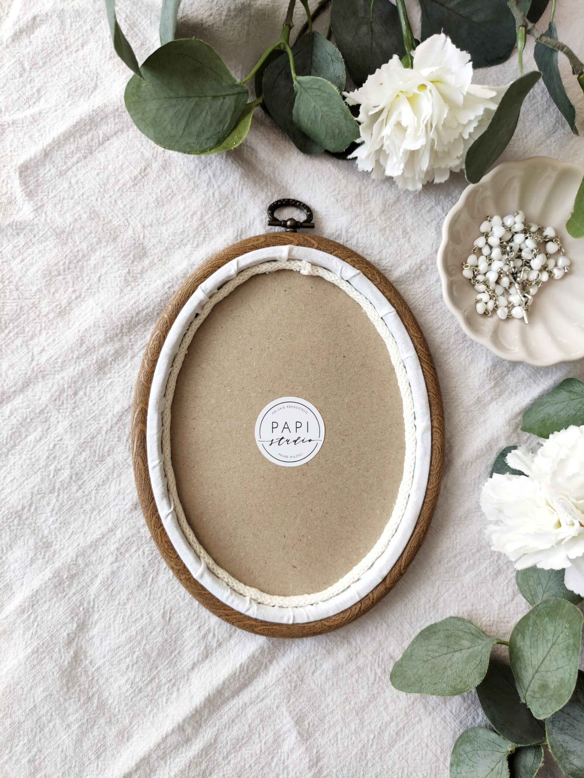 Obrazek jest oprawiony w owalny tamborek z uchwytem, dzięki czemu jest od razu gotowy do zawieszenia na ścianie w kąciku maluszka. Został zaprojektowany z myślą o wyjątkowych chwilach w życiu dziecka, dlatego to doskonały wybór na prezent z okazji Chrztu Świętego, roczku czy innych ważnych momentów. To obrazek, który zostanie z Wami na lata, będąc piękną ozdobą, ale przede wszystkim cenną pamiątką.