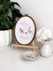 Każdy obrazek jest ręcznie haftowany, a specjalnie dla Ciebie projektuję go z imieniem Twojego dziecka, co sprawia, że staje się to naprawdę unikalna, osobista pamiątka, którą będziesz wspominać przez całe życie. To nie tylko prezent – to coś, co wzbogaci wspomnienia, które będą przekazywane przez pokolenia.